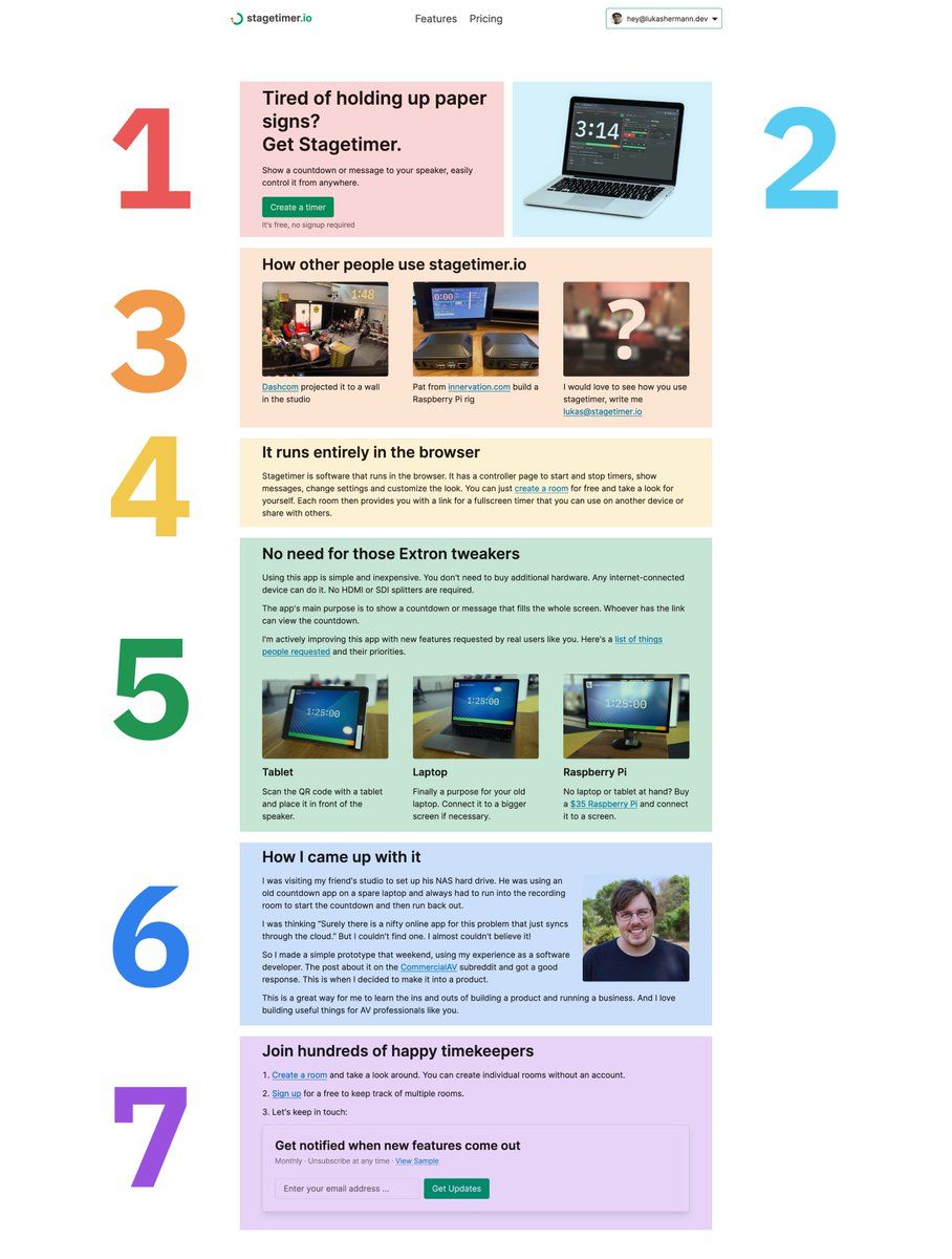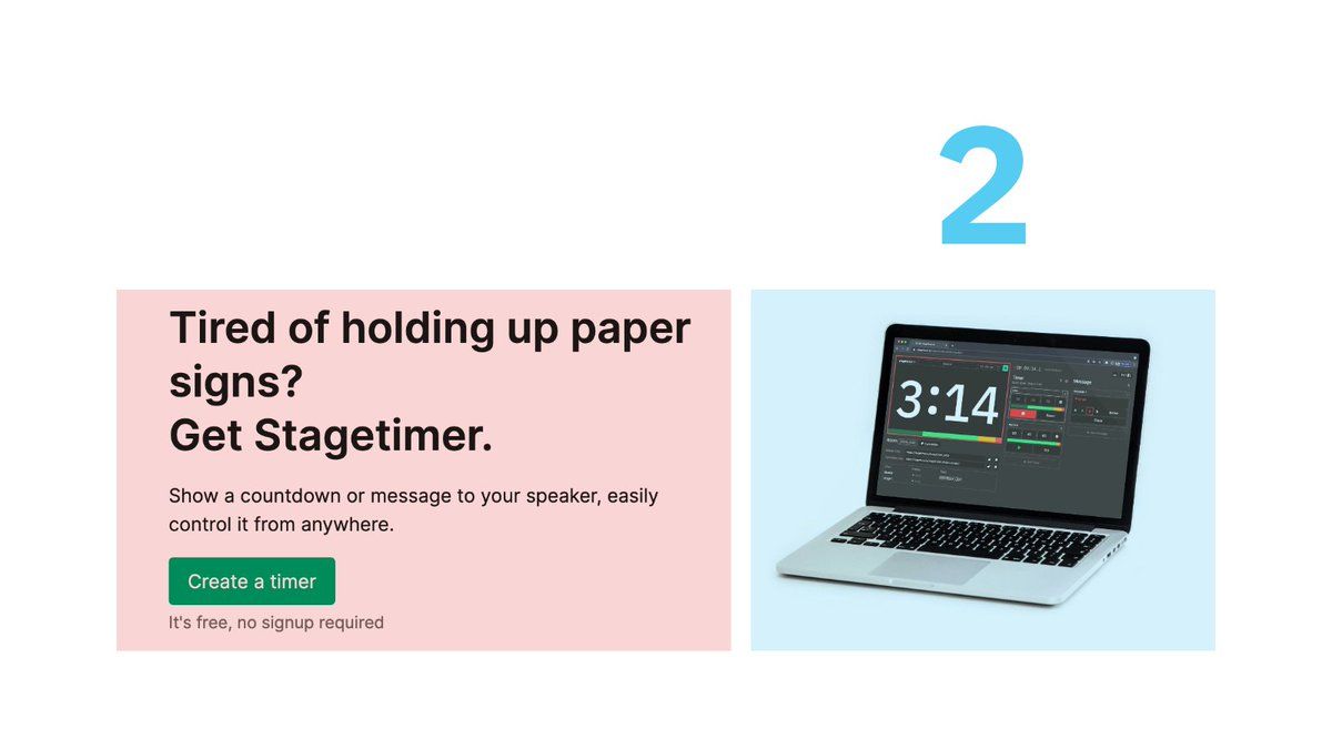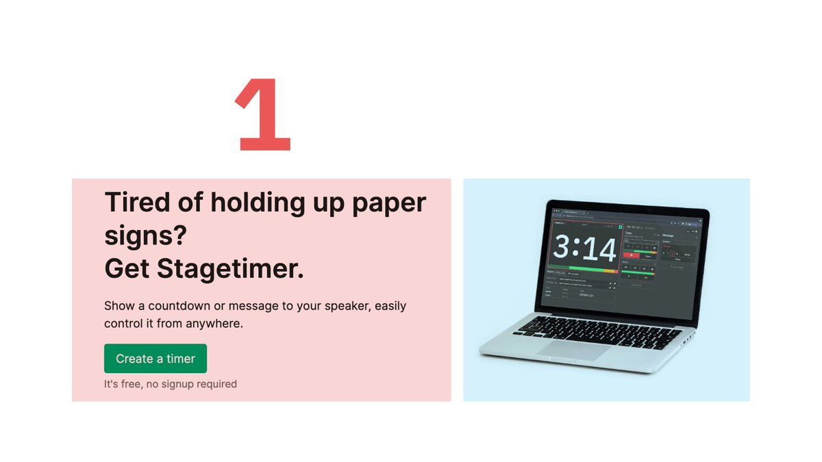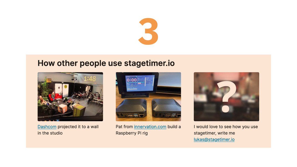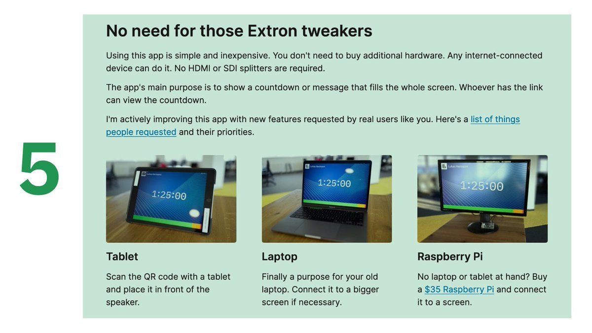 1 The title explains what stagetimer does. The subtitle explains how. It took me ~20 iterations to get the headline right. If you only read this, you should know what the app is about.