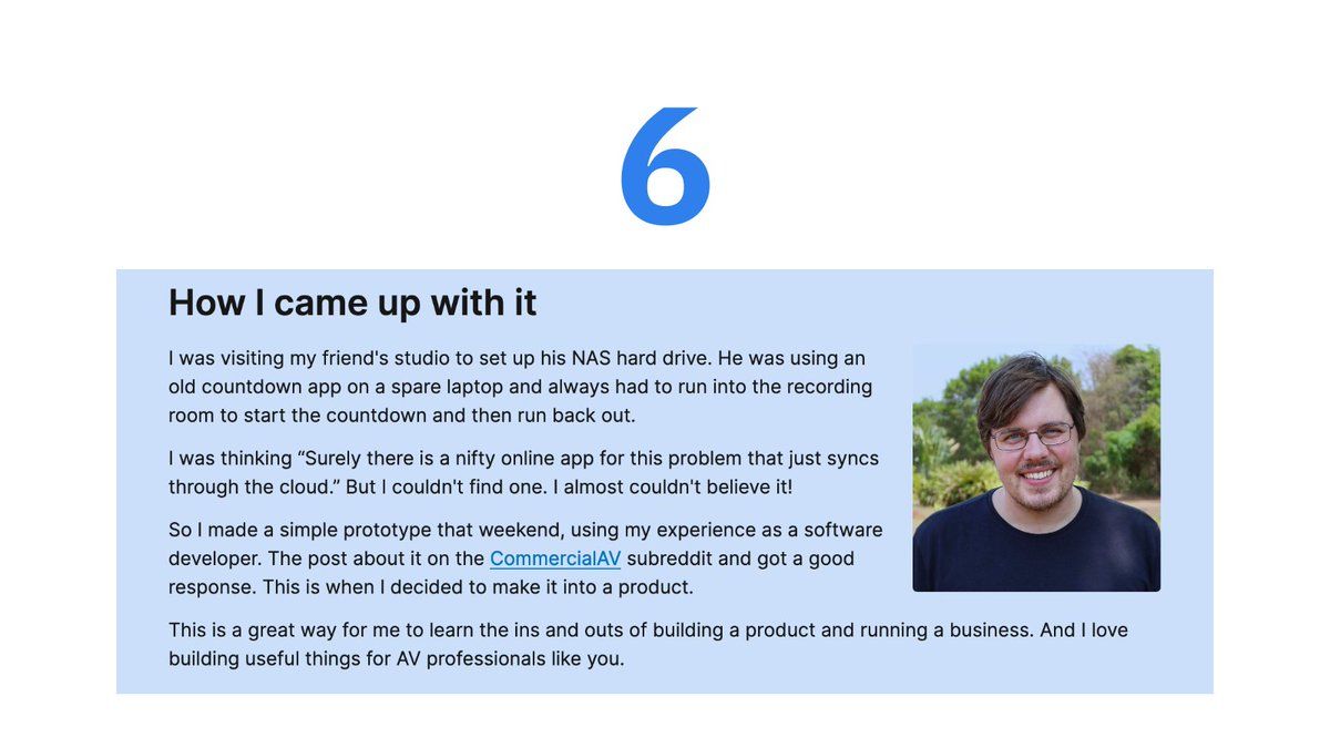 6 The founder's story. It tells how I came up with the idea to scratch my own itch. It shows how I combine my audio/video interest with my software developer profession. There is also my face to show that a real dorky human is behind the app 😄