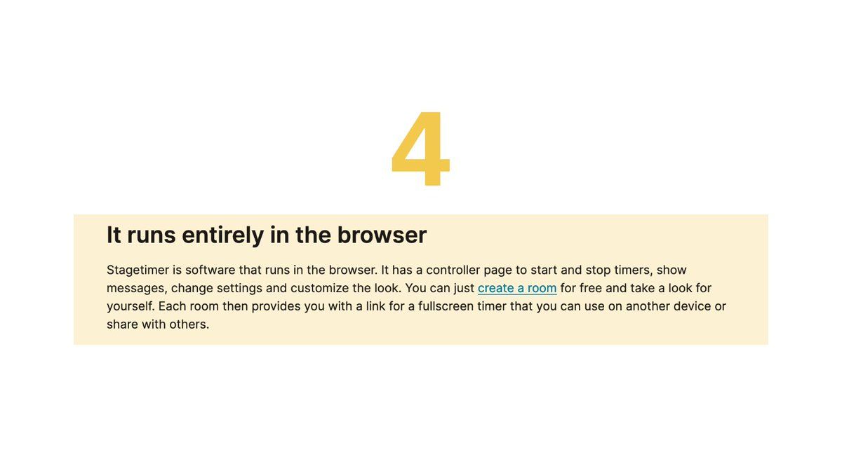 4 The features section. It explains stagetimer in the easiest and quickest way possible. Notice the headline highlights a USP.