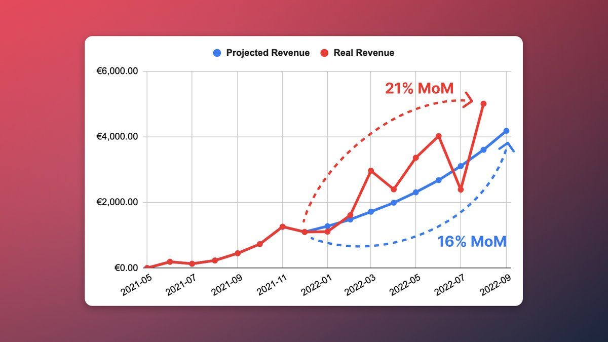 In January Liz and I sat together to define the goal for Stagetimer. We projected an ambitious growth of 16% MoM in revenue. As of August, we are at 21% MoM. If this continues we'll reach €83.3/month by November next year 🤯🤯🤯