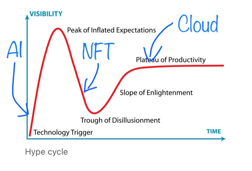 My hot take where some tech is on the hype cycle. 🤖 AI is going crazy in the next months, jump on the hype train now 🖼 NFTs are out, but will prove themselves one day ☁️ Cloud is proven, and with the $20B Figma deal stronger than ever