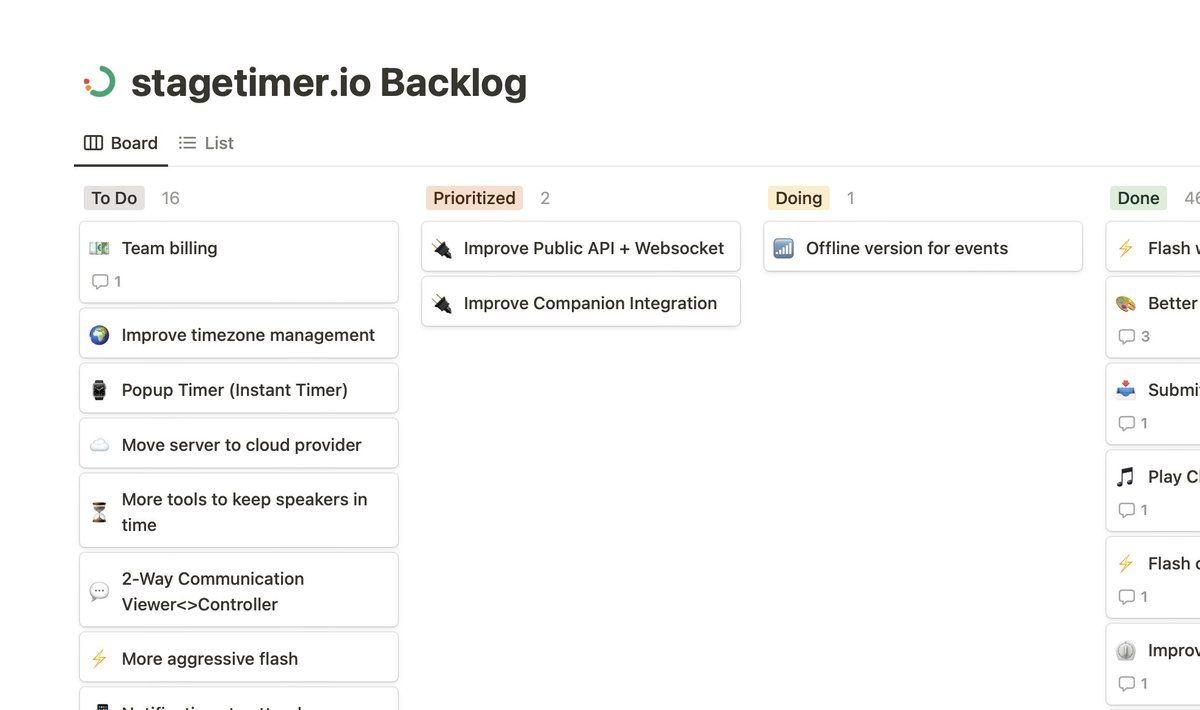 Here's ours: notion.so/744c5df925d248129f2bad199433cff9?v=e8dacc1a65d9487ab053335425b2af55 Note the "Will not implement" column. It helps a lot with clarifying what's outside your scope. And the "Done" column is also a great place to add or link to documentation. Feel free to use it as template for your own project.