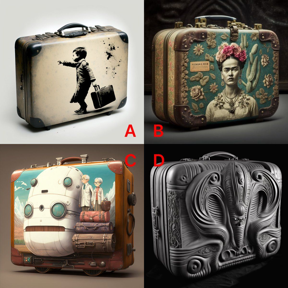 I asked an AI to generate an image of a suitcase in the style of ... Can you guess the artists?