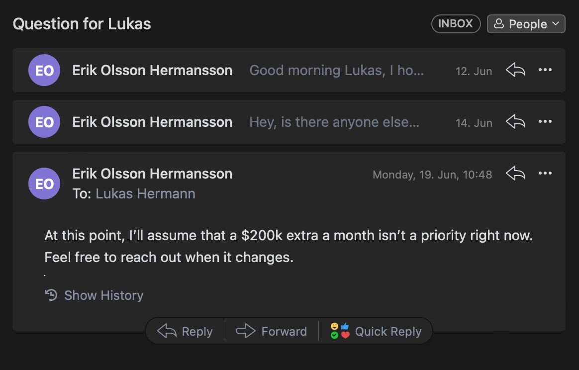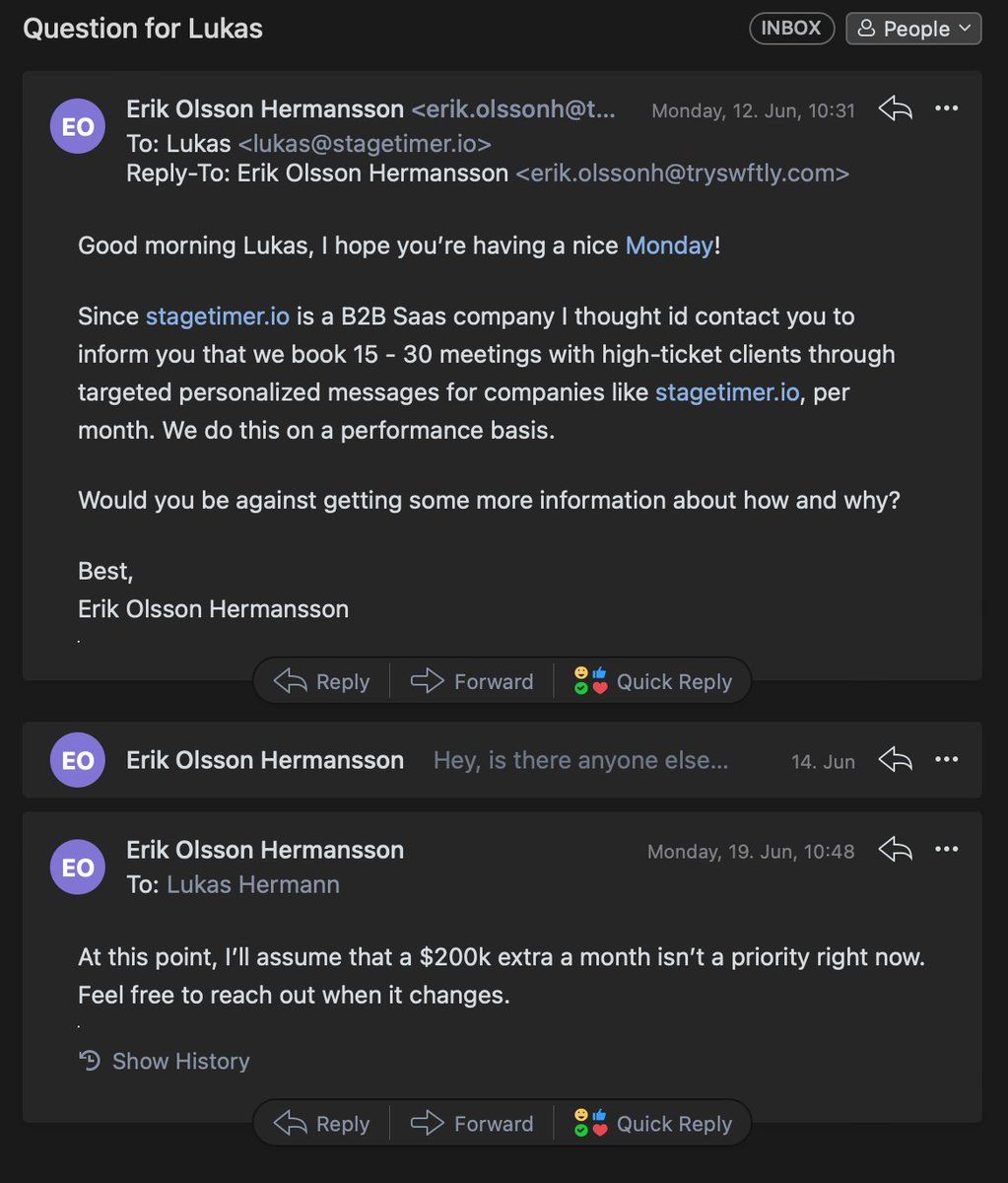 I should add more content. He's trying to sell me his cold email services as far as I can tell. We've tried smth similar in the past. It's neither "targeted" nor "personalized" and made people mad and brought no leads. Just modern day spamming.