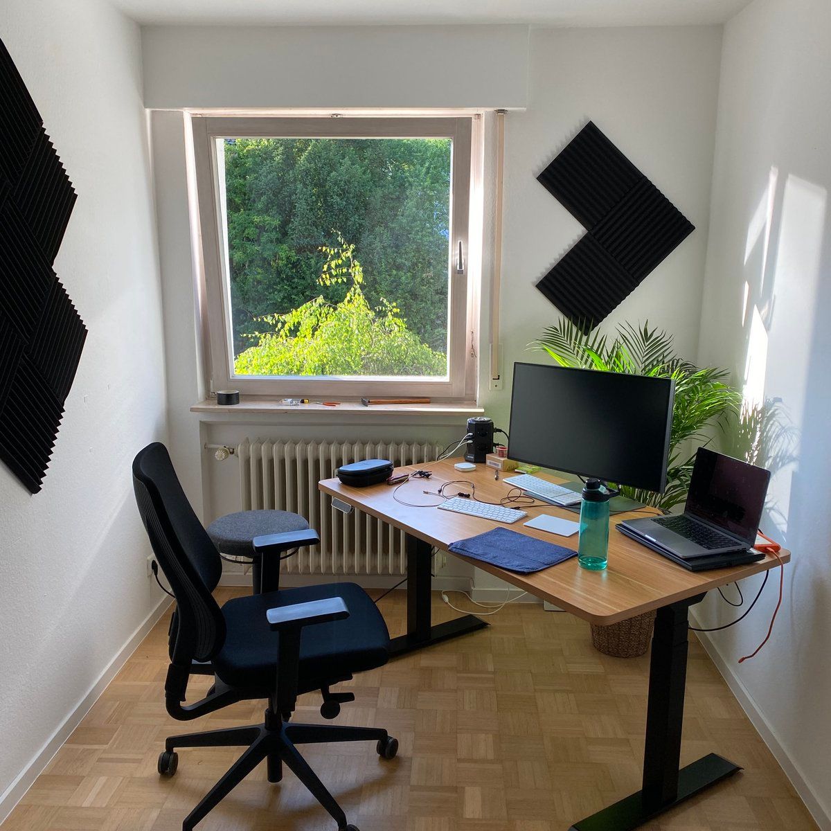 Update on the new office situation: There's now a leafy plant, acoustic panels, and the desk rotation allows me to muse the outside world 😄