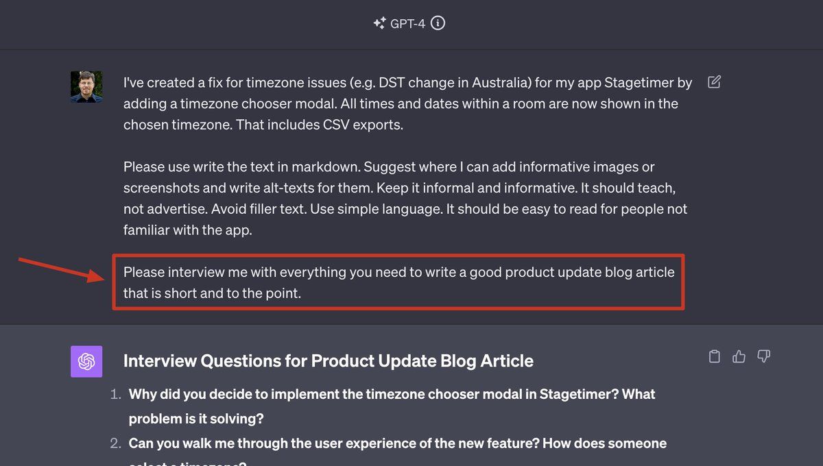 This is how I use ChatGPT to write good product update blog posts. The magic prompt is: "Please interview me about everything you need to write a good product update blog post."