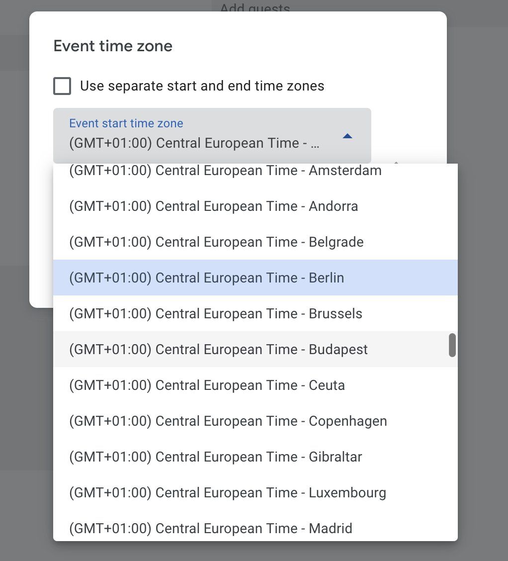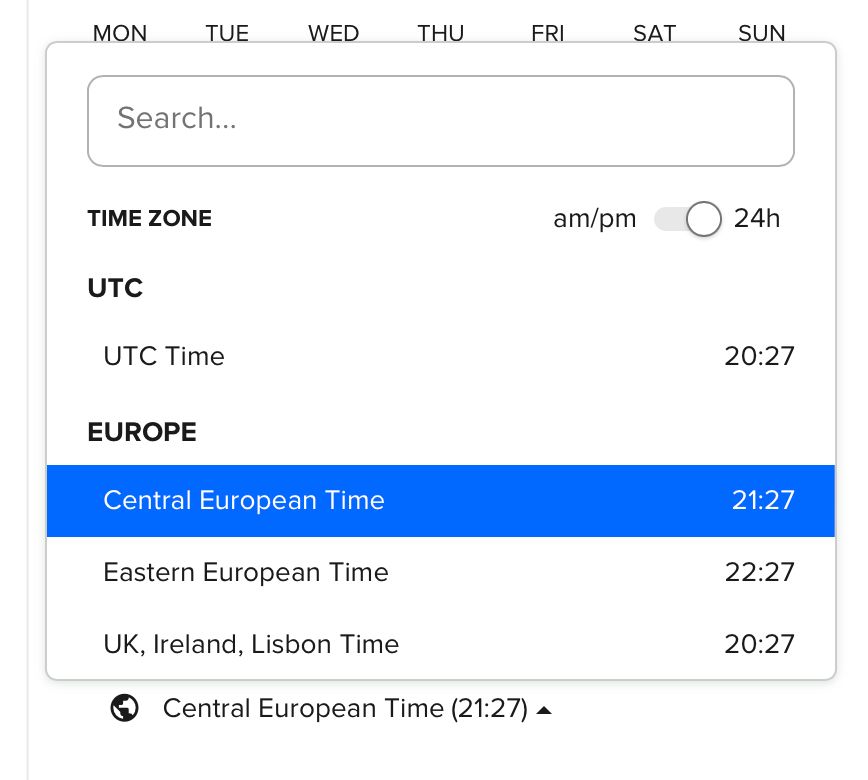 I'm obsessed with timezone pickers now! There seems to be no established best practice. Calendly groups timezones and shows current time as reference. Google lets you choose by city and shows GMT offset.